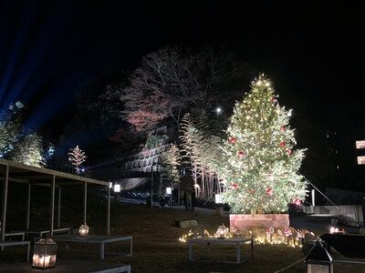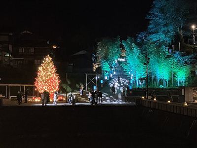 温泉街のシンボル・恩湯広場には、高さ約6メートルの本物のもみの木ツリーが登場し、星をモチーフにした優しい光が広場を包み込みます。 竹林の階段もクリスマス仕様の特別な光の演出で、金子みすゞの詩と幻想的な灯りが聖なる夜を彩ります。​